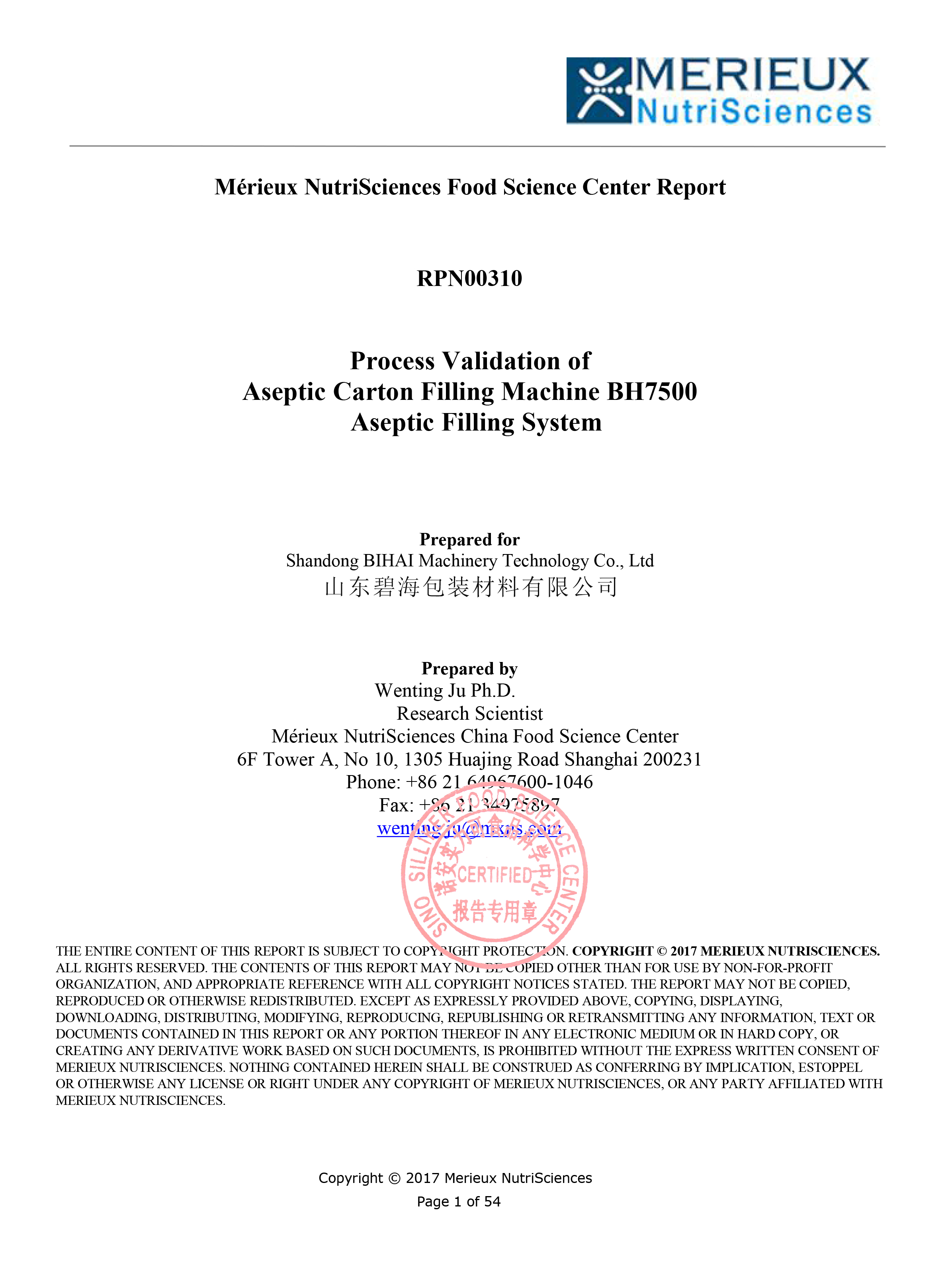 2017年5月,山東碧海包裝材料有限公司喜訊再傳,其生產(chǎn)的BH7500系列無菌紙盒灌裝機(jī)通過了法國諾安實(shí)力可商品檢驗(yàn)有限公司挑戰(zhàn)性無菌驗(yàn)證。